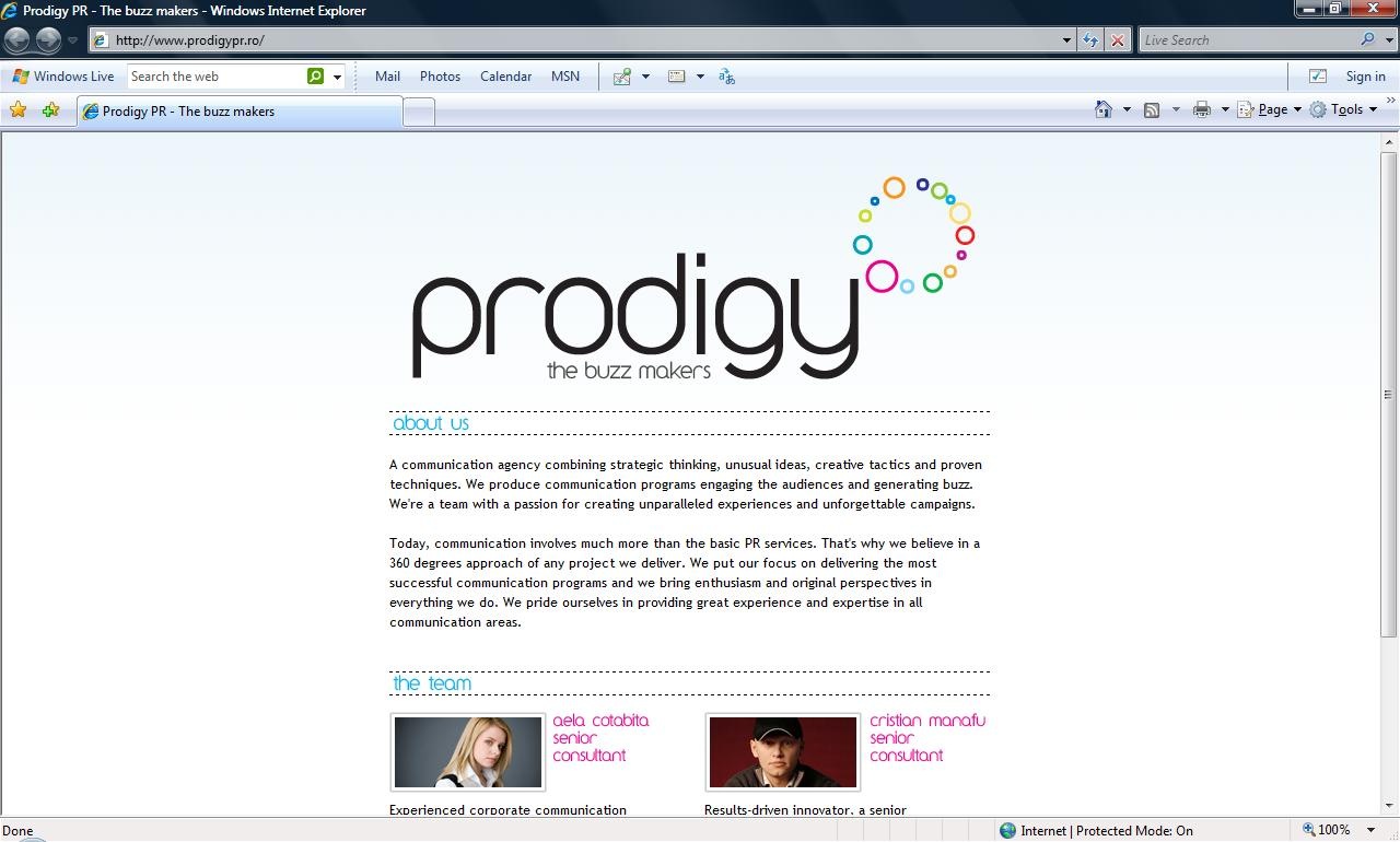 Prodigy° porneşte la drum cu o echipă permanentă de 3 consultanţi, cărora li se adaugă câţiva colaboratori pentru proiecte punctuale şi are deja în derulare proiecte de comunicare prin new media, care momentan nu pot fi făcute publice.