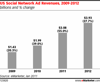 Aproape 11% – adica 3,08 miliarde de dolari – din bugetul de marketing al companiilor din SUA va merge in 2011 catre retelele sociale, indica firma de cercetare eMarketer.