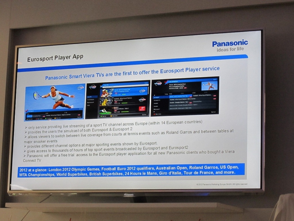 Televizoarele de tip smart Panasonic Viera model 2012 (full HD 3D) vin preinstalate cu o aplicatie Eurosport care ne arata cam cum va fi televiziunea viitorului.