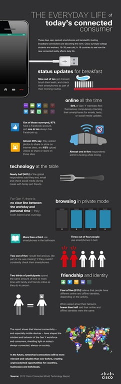 Aproximativ 90% dintre tinerii încadrați în generaţia Y (născuți după 1980) spun că îsi verifică e-mail-ul, mesageria şi profilurile de pe site-urile de socializare de pe smartphone înainte de a se ridica din pat – relevă studiul Cisco Connected World Technology.