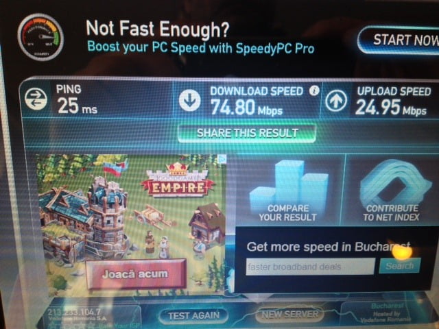 În testele de astăzi, făcute pe un smartphone Samsung Galaxy S3, rețeaua 4G a Vodafone din Brașov a permis viteze de aproximativ 70 Mbps la download şi de 35 Mbps pentru upload.