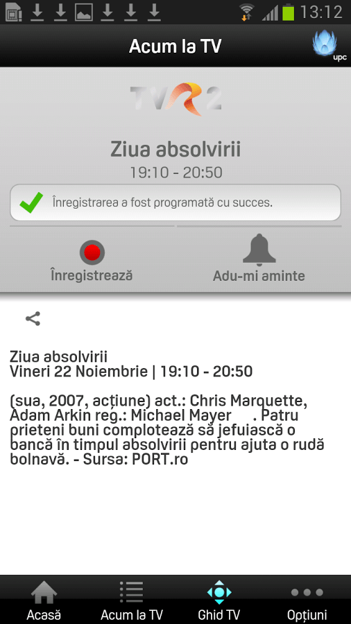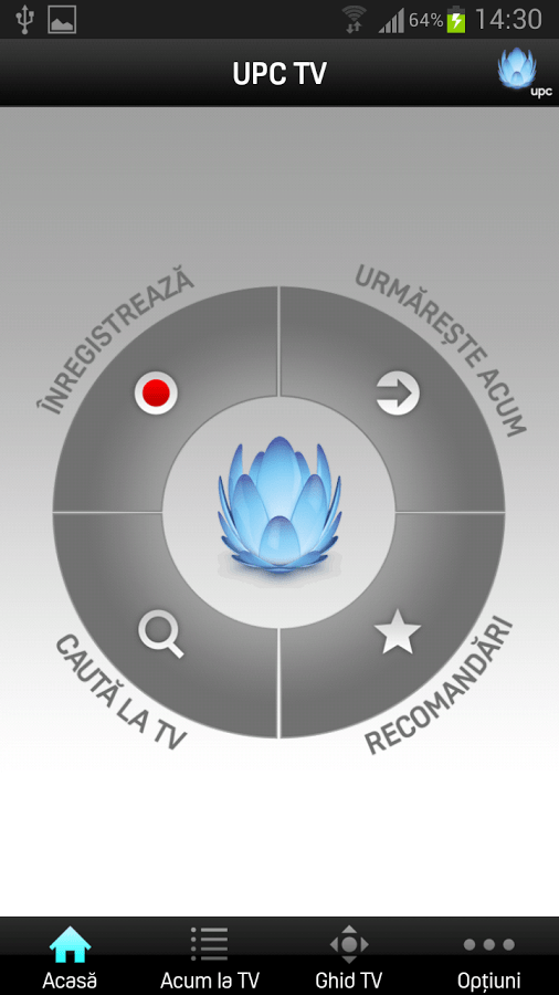 UPC România a lansat pentru smartphone-urile și tabletele cu Android aplicația mobilă UPC TV care ne permite să înregistrăm de la distanță, de pe aceste echipamente, emisiuni ale canalelor TV pe care le transmite operatorul.