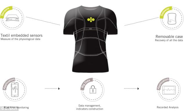 Realizat împreună cu cercetătorii de la Cityzen Sciences, tricoul are inserați în țesătură micro-senzori care înregistrează ritmul cardiac, poziția GPS, viteza, temperatura, altitudinea.
