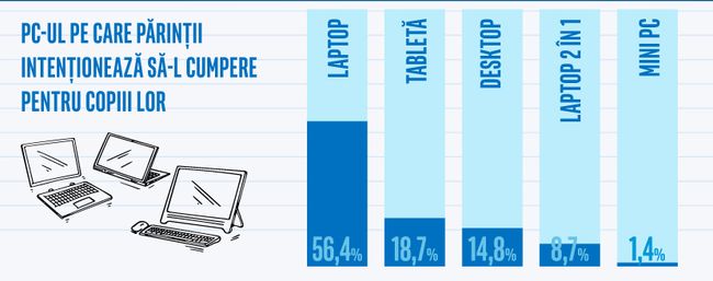 Astfel, 56,4% dintre părinți intenționează să cumpere pentru copiii lor un laptop, spre deosebire de 18,7% care vor o tabletă, 14,8% – un desktop PC, 8,7% – un laptop 2 în 1 și 1,4% un mini PC.