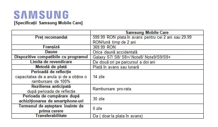 Clienții pot achiziționa asigurarea de pe samsung.com/ro în termen de 30 zile de la cumpărarea noului dispozitiv mobil și au o perioadă de 14 zile după achiziție, în cazul în care doresc să anuleze cererea.